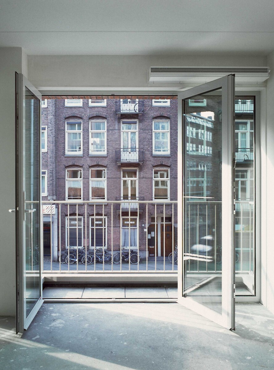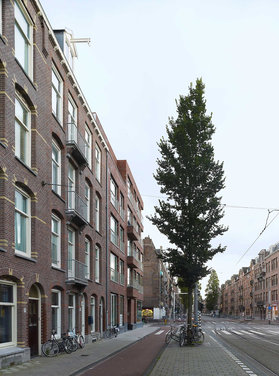 The new building along Jan van Galenstraat is situated at the end of an elongated perimeter block. This block links 19th century buildings on Admiraal de Ruyterweg with the historic Amsterdam School ensemble by J. Roodenburgh on Bestevaerstraat. The ground floor consists of commercial spaces and the upper floors are senior apartments with maisonnettes above. The building is conceived as a new ending to the block. The subtle modulation of its refined brick facade reconciles the complex conditions of the site – the historic border bisecting the location, the entrances to the commercial premises, the corners and the connections with existing buildings. To anchor the building in its surroundings a number of architectural elements characteristic of its historic neighbours are incorporated in the design including a plinth, balconies and decorative brickwork. At the same time the building gives expression to the new programme at this unique place in the city.