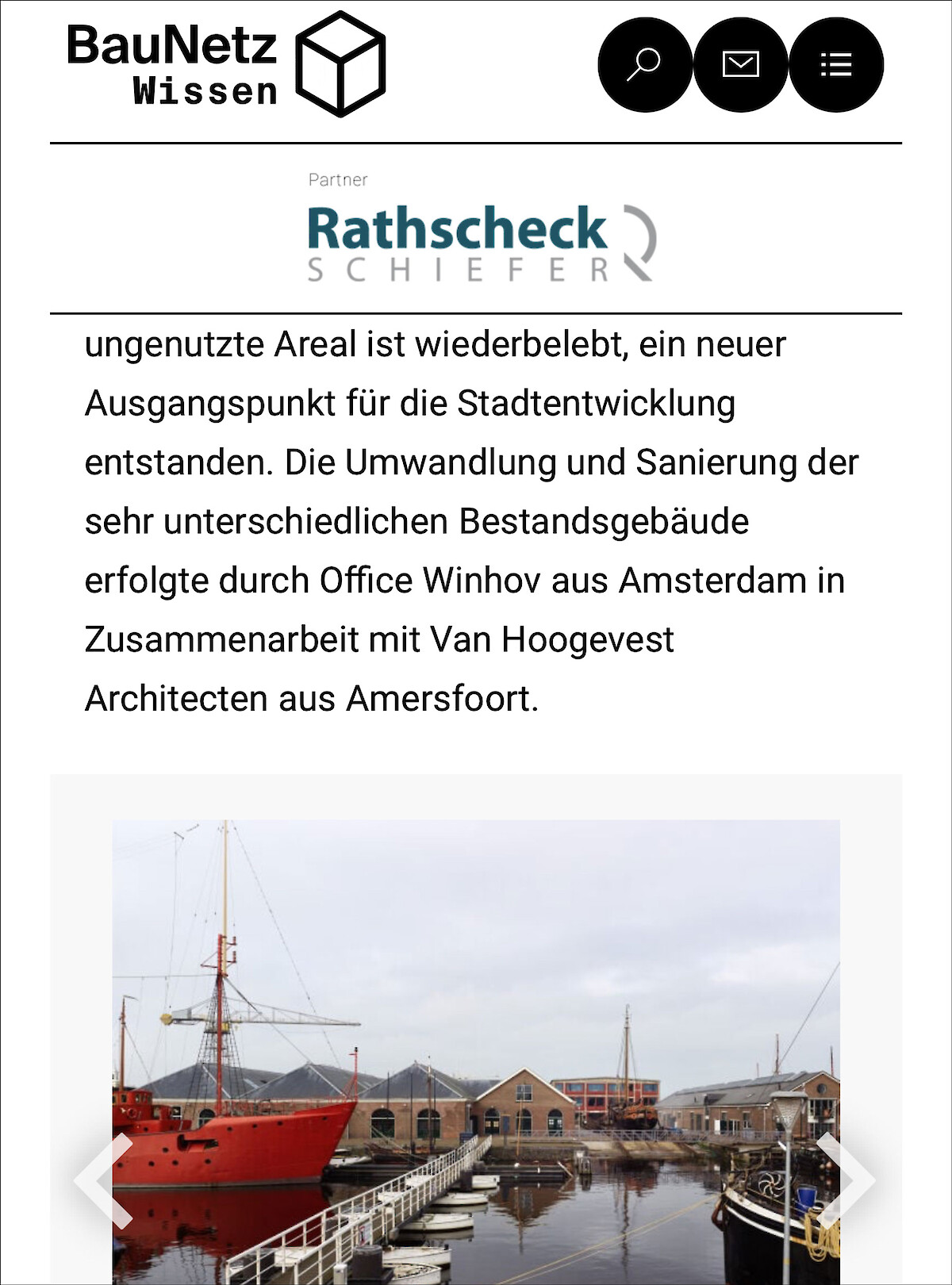 De twee herbestemde historische panden op rijkswerf Willemsoord – het negentiende eeuwse rijksmonument de mastenloods en de na-oorlogse zeilmakerij – zijn gepubliceerd in BauNetz. Het artikel Marinebauten revitalisiert belicht het nieuwe stadhuis ontworpen door Office Winhov en Van Hoogevest Architecten. Lees het artikel hier (in het Duits).