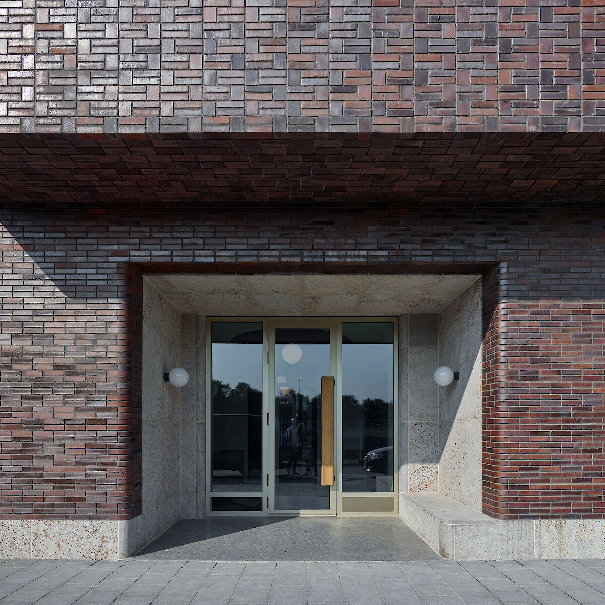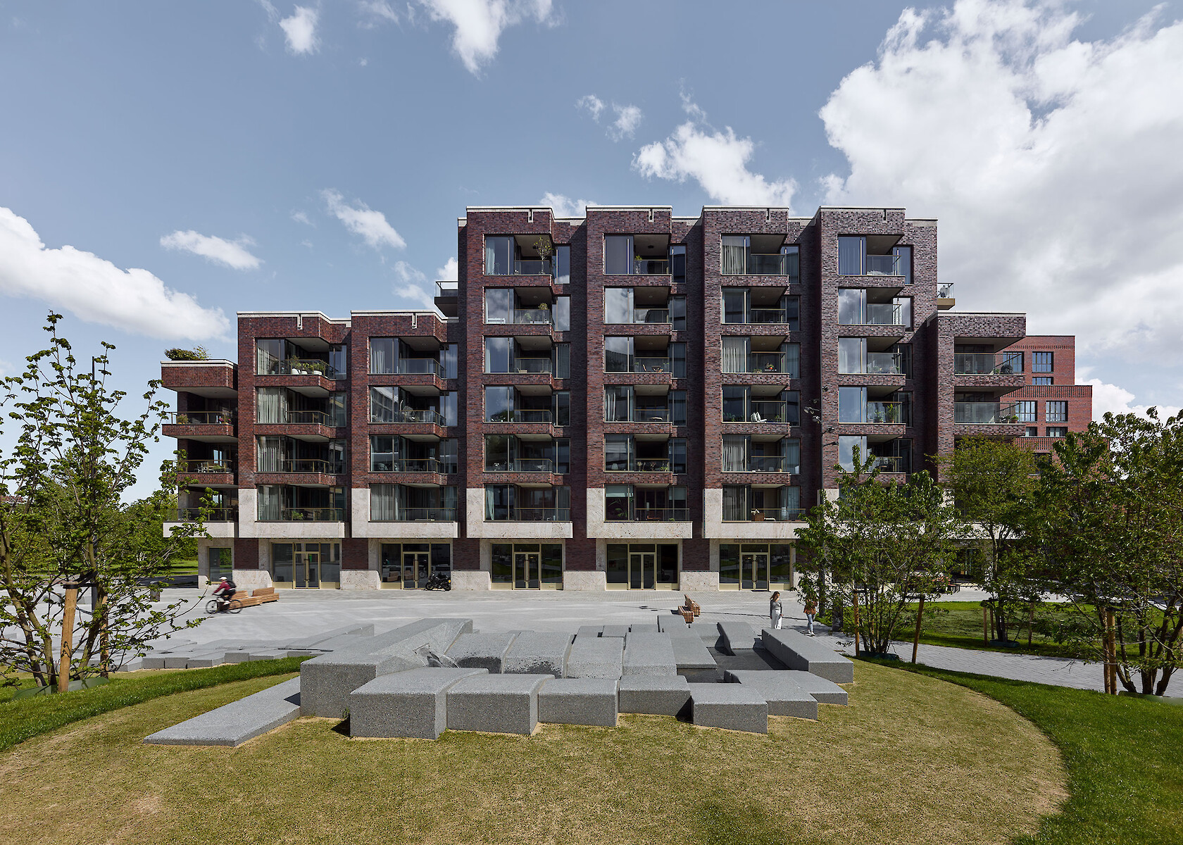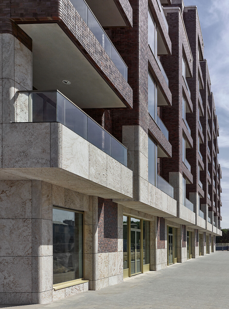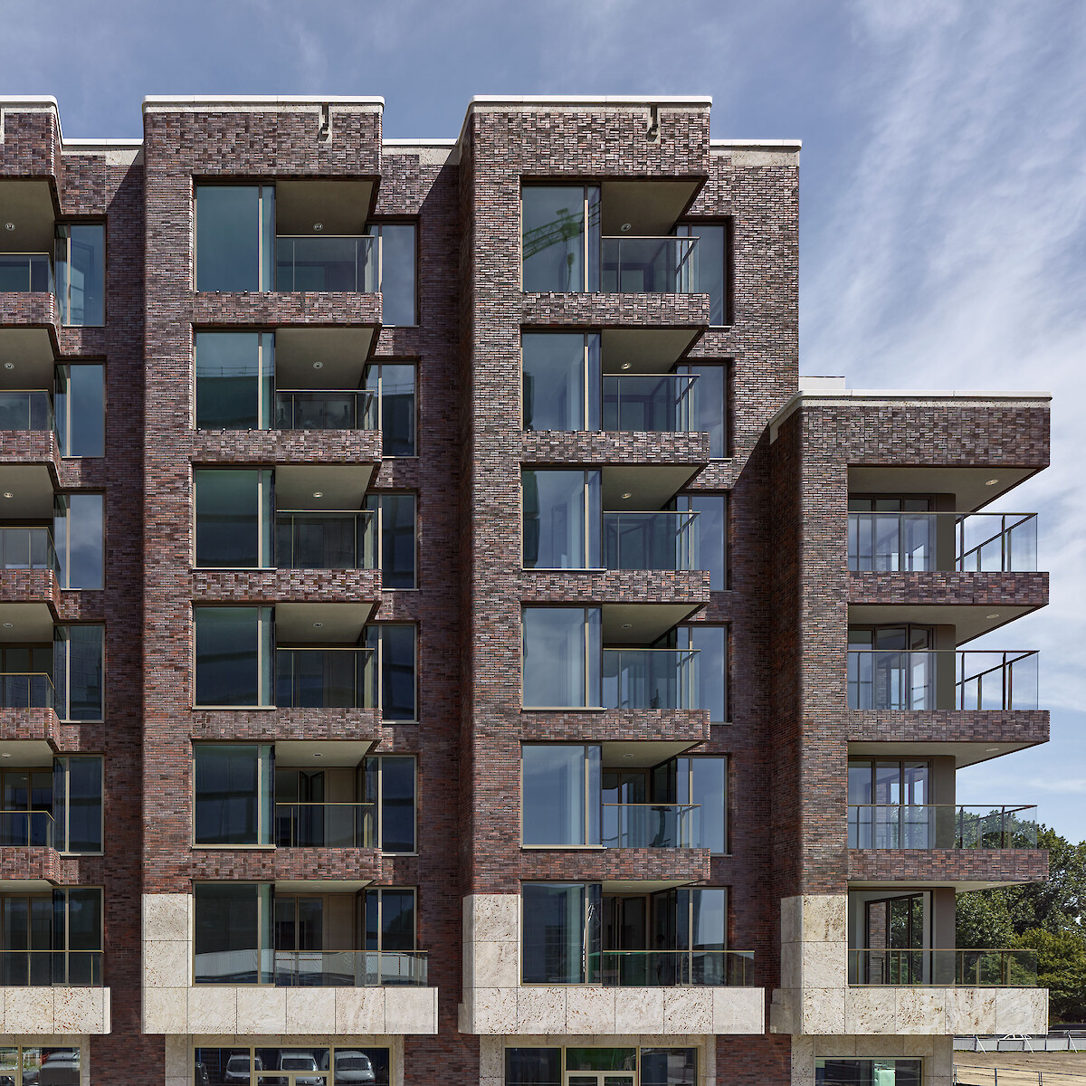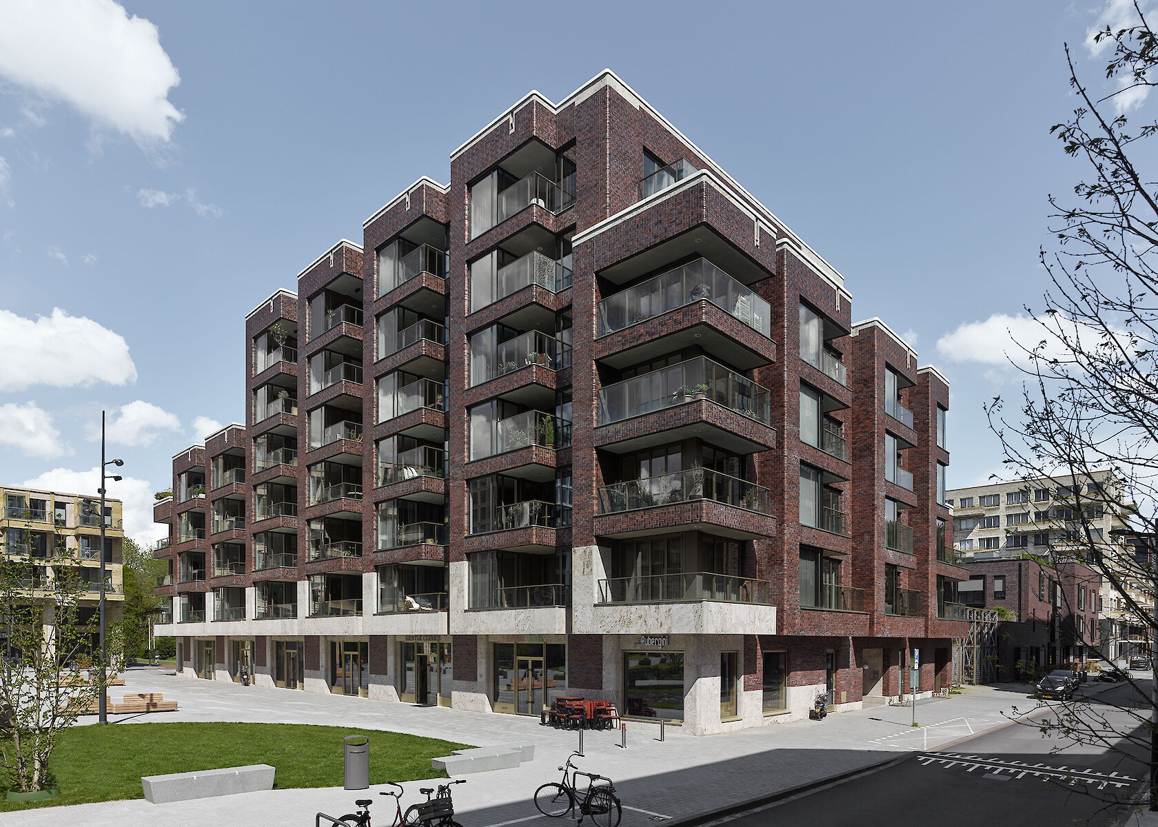 Woongebouw SUD resoneert met de traditie van moderne monumentale woongebouwen in Amsterdam. De dertien erkers van SUD vouwen zich rond het gebouw en zijn bekleed met een zacht glanzende Wittmunder klinker. Het metselwerk heeft een rijke kleurnuancering en is uitgevoerd in een halfsteens blokverband met afgeronde hoeken en een decoratief patroon in de erkers. De natuurstenen plint en dakrand versterken het sculpturale karakter van het woongebouw en verankeren het stevig aan het nieuwe en levendige plein.